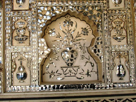 Visitors in the Shish Mahal, or Palace of Mirrors. Mirror and glass inlay designs cover the ceiling and walls Mirror-work wall decoration in Amber Palace I join the group on a tourist bus to nearby Jaipur. The city streets are a kaleidoscope of movement and colour. Supercilious camels vie for right of way with horse-drawn tongas , bullock-carts, rickshaws, scooters and cars. Rajasthani women, bedecked with nose-rings and necklaces, wearing mirror-work blouses and skirts, smile as they sway past with earthenware pots balanced on their heads. Men, with enormous yellow or orange turbans and moustaches which erupt off their cheeks, sit in groups smoking hookas or bidis .